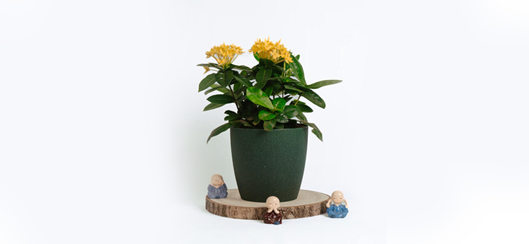 Vibrant Ixora yellow clusters of Ixora brighten your workspace immediately. The flowers are a symbol of positive energy and enthusiasm, ideal for Monday morning. It prefers moderate lighting and should be watered once the soil gets dry. Position it in front of a sunny window, and it will thank you with flowers that illuminate your area and your mood.