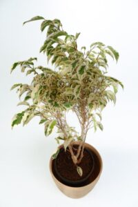 Ficus benjamina Variegated, also known as the Weeping Fig, is a graceful indoor plant with arching branches and striking green-and-cream variegated leaves. It adds elegance and height to living rooms, lobbies, or office corners. This plant is popular for its air-purifying qualities and its ability to adapt well to indoor environments. It thrives in bright, indirect light and prefers stable conditions without frequent changes. With its ornamental foliage and tree-like form, it brings a natural charm to any space.