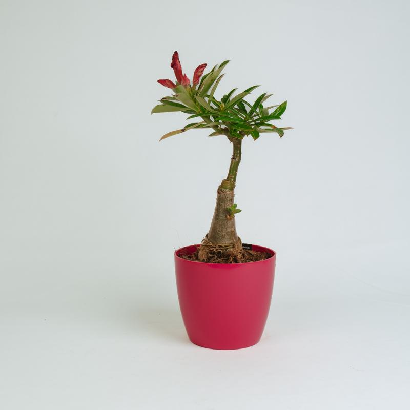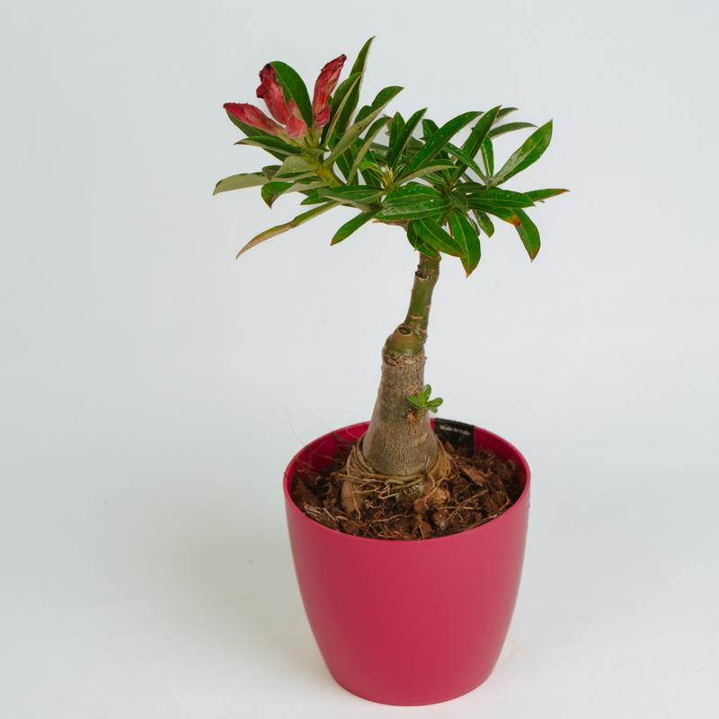 Adenium, also known as Desert Rose, is a striking succulent with a swollen base and vibrant, trumpet-shaped flowers in shades of pink, red, or white.