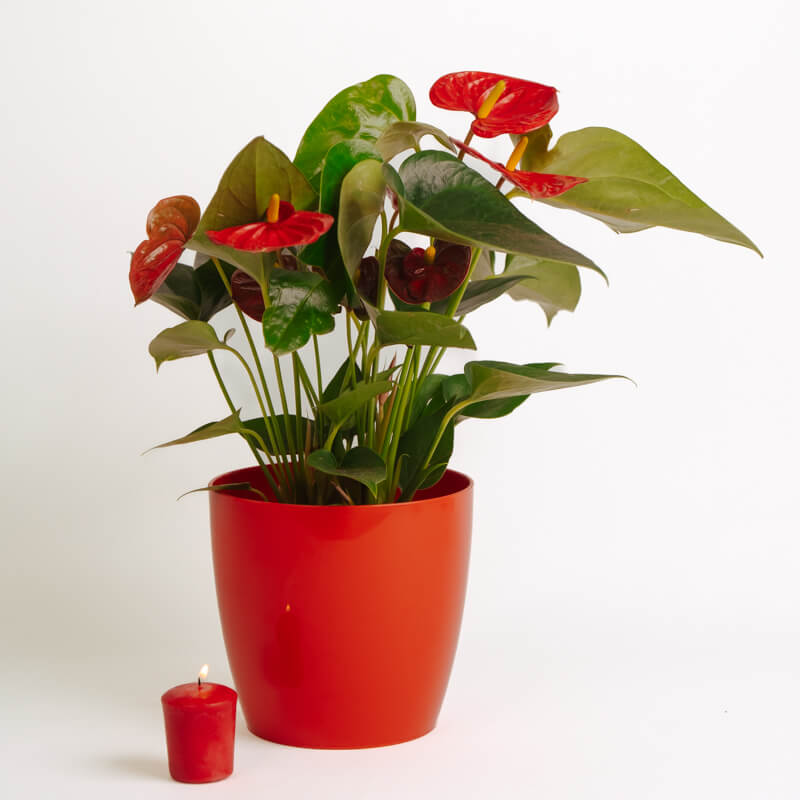 Red Anthurium is a striking tropical plant known for its glossy, heart-shaped leaves and vibrant red, waxy flowers. Often called the ?Flamingo Flower,? it adds a bold splash of color to any indoor space. Its unique, long-lasting blooms make it a popular choice for home d?cor and gifting. Red Anthuriums thrive in warm, humid conditions with bright, indirect light. With proper care, this elegant plant blooms year-round, bringing beauty and freshness indoors.