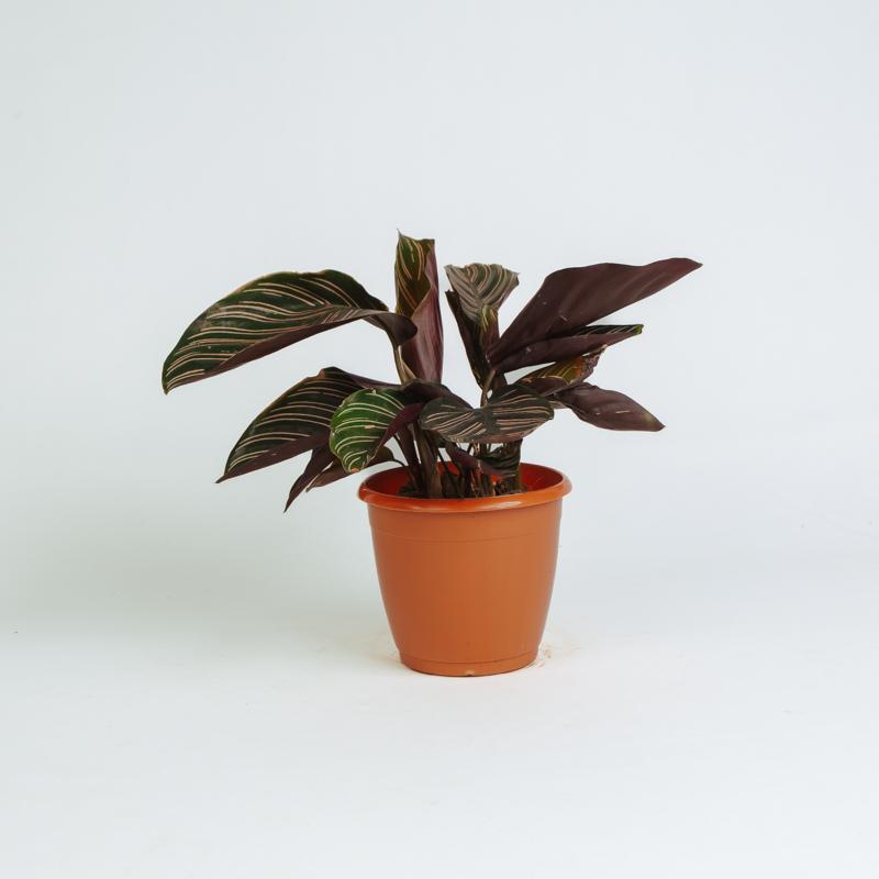 Calathea Ornata, also known as Pinstripe Plant, features deep green leaves adorned with elegant pink or white stripes.