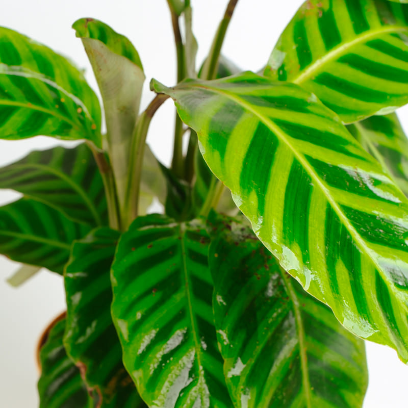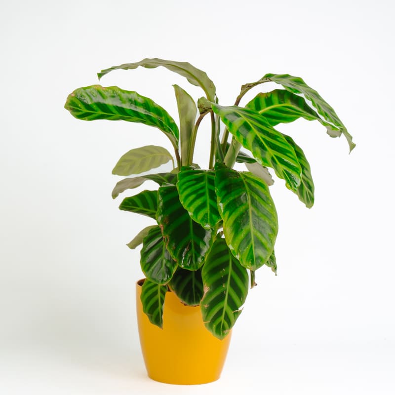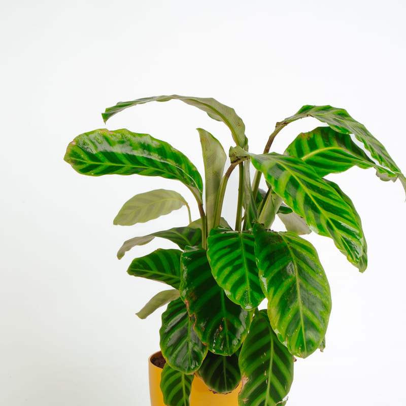 Calathea Zebrina, also known as the Zebra Plant, is admired for its velvety leaves with bold, zebra-like dark green stripes on a lighter green background.
