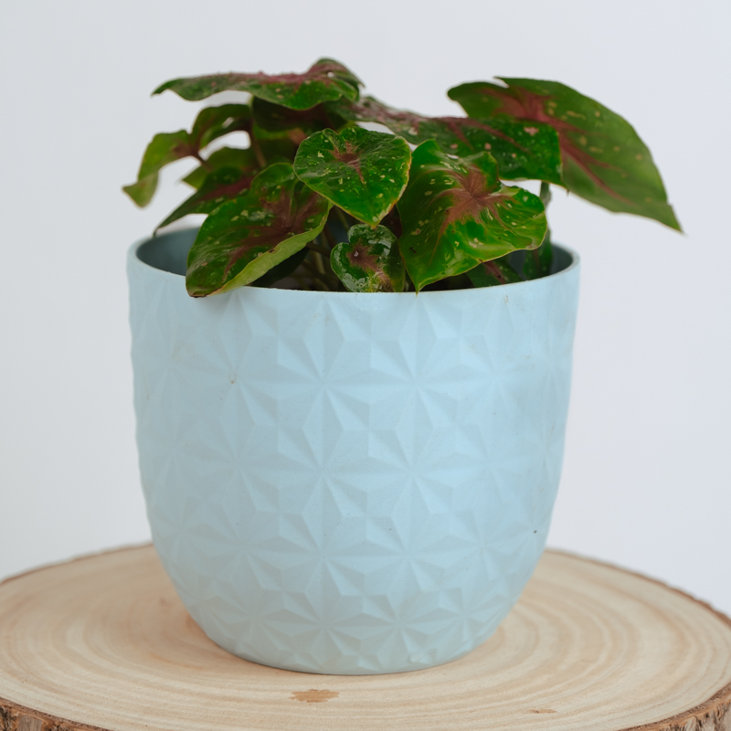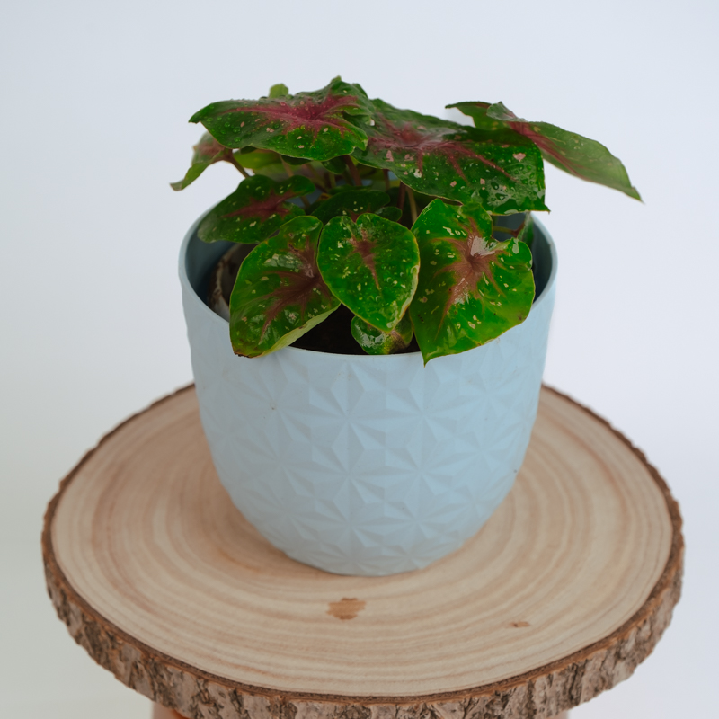 Caladium bicolor is a stunning ornamental plant known for its vibrant, heart-shaped leaves in striking combinations of red, pink, green, and white. Its bold foliage brings a tropical flair to gardens, balconies, and indoor spaces. Caladiums thrive in warm, humid conditions and are often grown as seasonal plants in cooler climates. They prefer shaded or partially shaded areas, making them perfect for brightening low-light corners. With their eye-catching colors and dramatic patterns, Caladium bicolor plants are a favorite for decorative landscaping and container gardening.