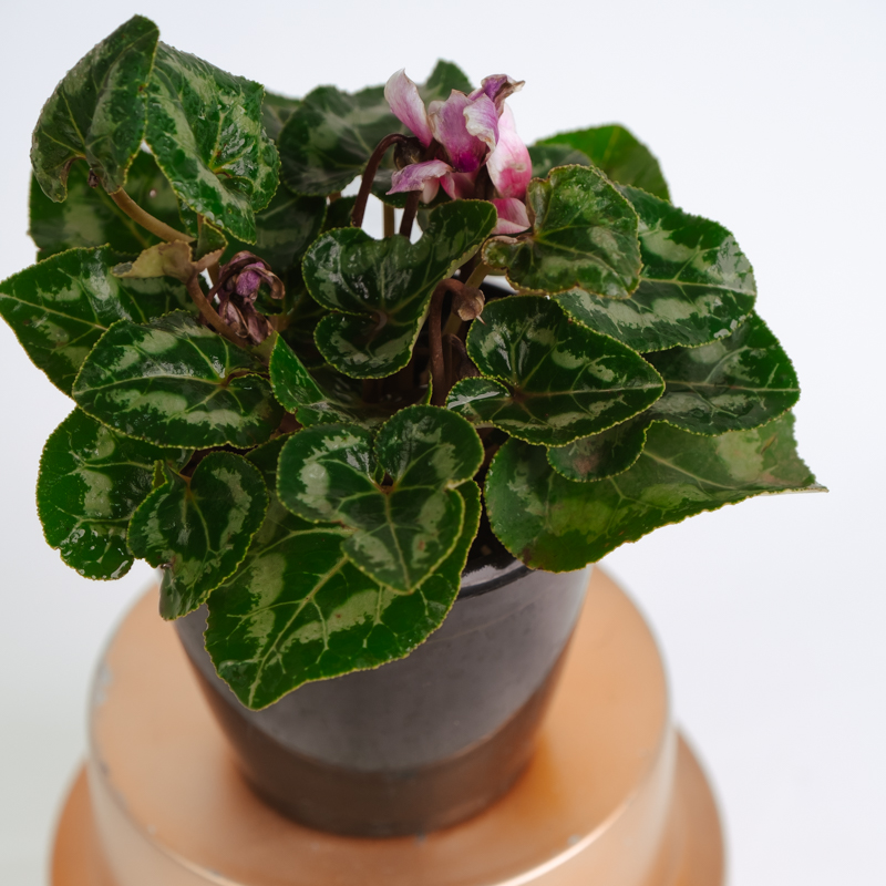 Cyclamen is a charming flowering plant known for its upswept petals and heart-shaped leaves often patterned with silver. Blooming in shades of pink, red, white, and purple, it adds a cheerful touch to indoor spaces during the cooler months. Cyclamen thrives in cool temperatures and bright, indirect light. Its delicate flowers and attractive foliage make it a favorite for winter decor and tabletops. With proper care, cyclamen offers a long-lasting display of color and elegance.