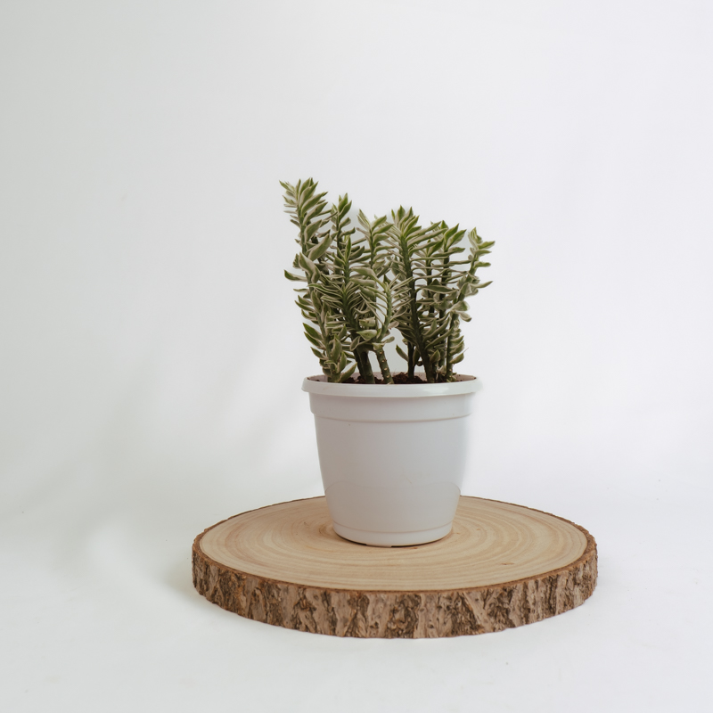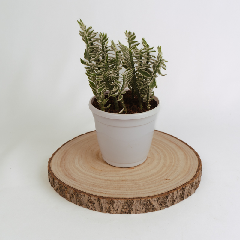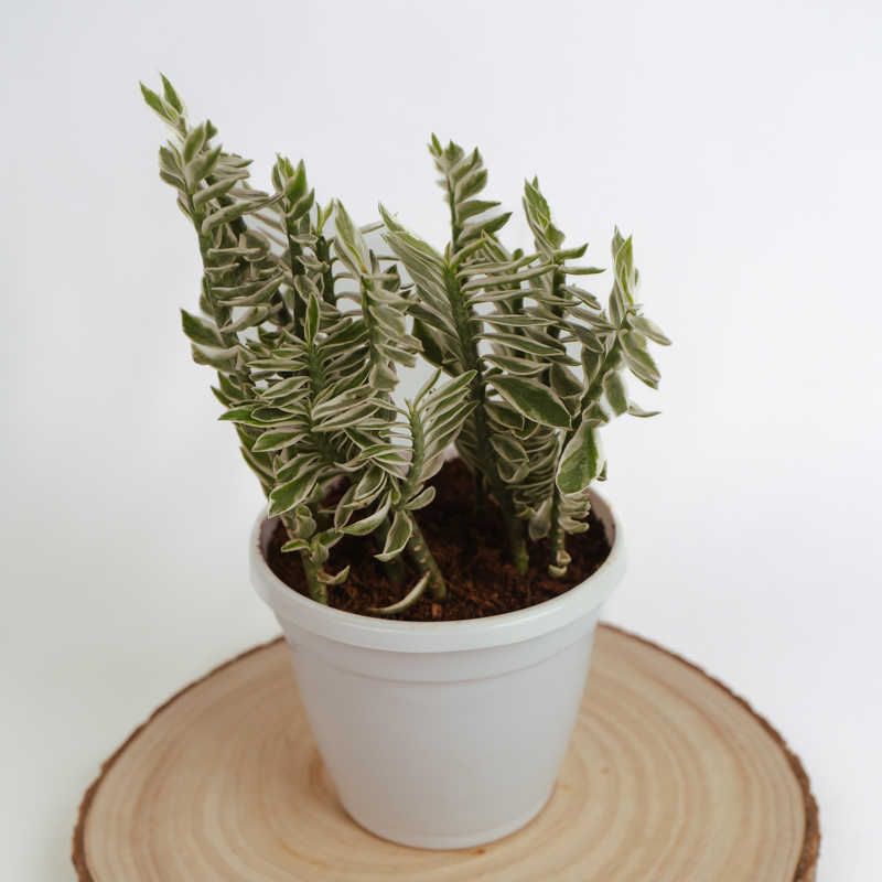 Pedilanthus Variegated, also known as Pedilanthus tithymaloides or Devil?s Backbone, is a unique succulent with zig-zag stems and creamy-white variegated leaves. Its unusual, angular growth gives it a striking architectural appeal, perfect for both indoor and outdoor settings. The plant is drought-tolerant and thrives in warm, sunny conditions, making it ideal for low-maintenance gardens. Occasionally, it produces small, reddish flowers that resemble tiny slippers. Pedilanthus Variegated adds visual interest with its quirky shape and contrasting foliage, making it a favorite among collectors and design enthusiasts.