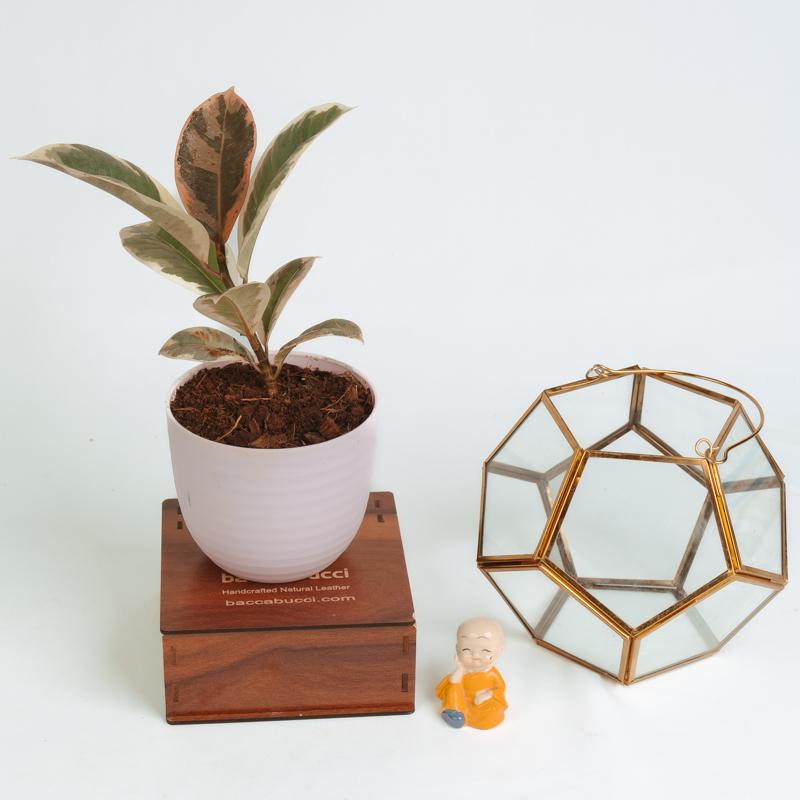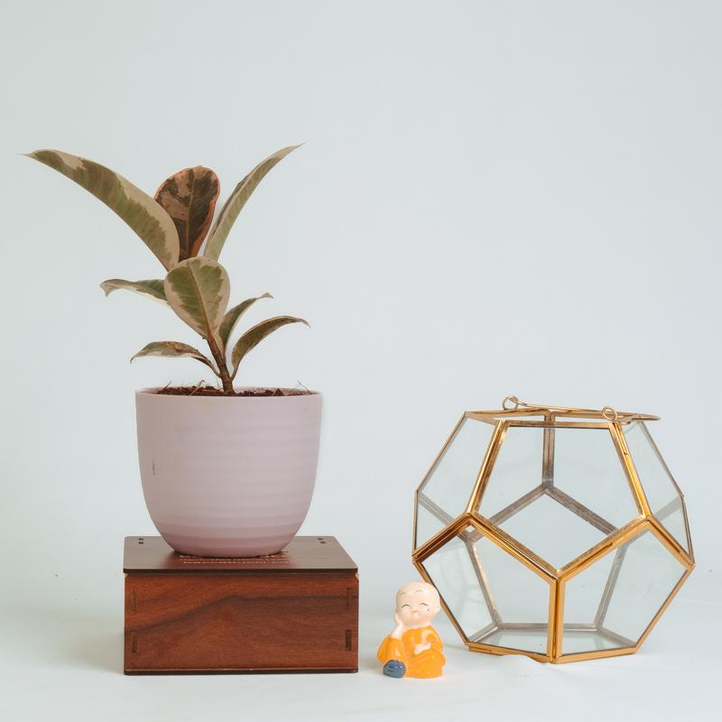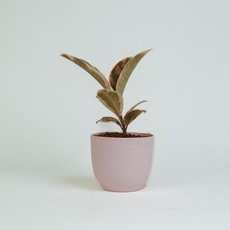 Variegated Rubber Plant features bold, glossy leaves with cream, green, and pink tones, adding a stylish tropical vibe to interiors.