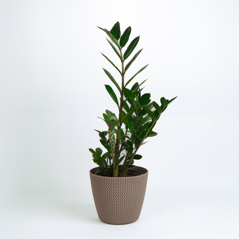 The Green Zamia, also known as Zamia zamiifolia or ZZ plant, is a hardy indoor plant known for its glossy, deep green leaves and upright growth. It adds a modern, stylish touch to homes and offices with minimal effort. This plant is incredibly low-maintenance and thrives in low to bright indirect light. Its thick, waxy leaves help it retain water, making it drought-tolerant. The Green Zamia is also known for purifying air and being highly resilient in various indoor conditions.